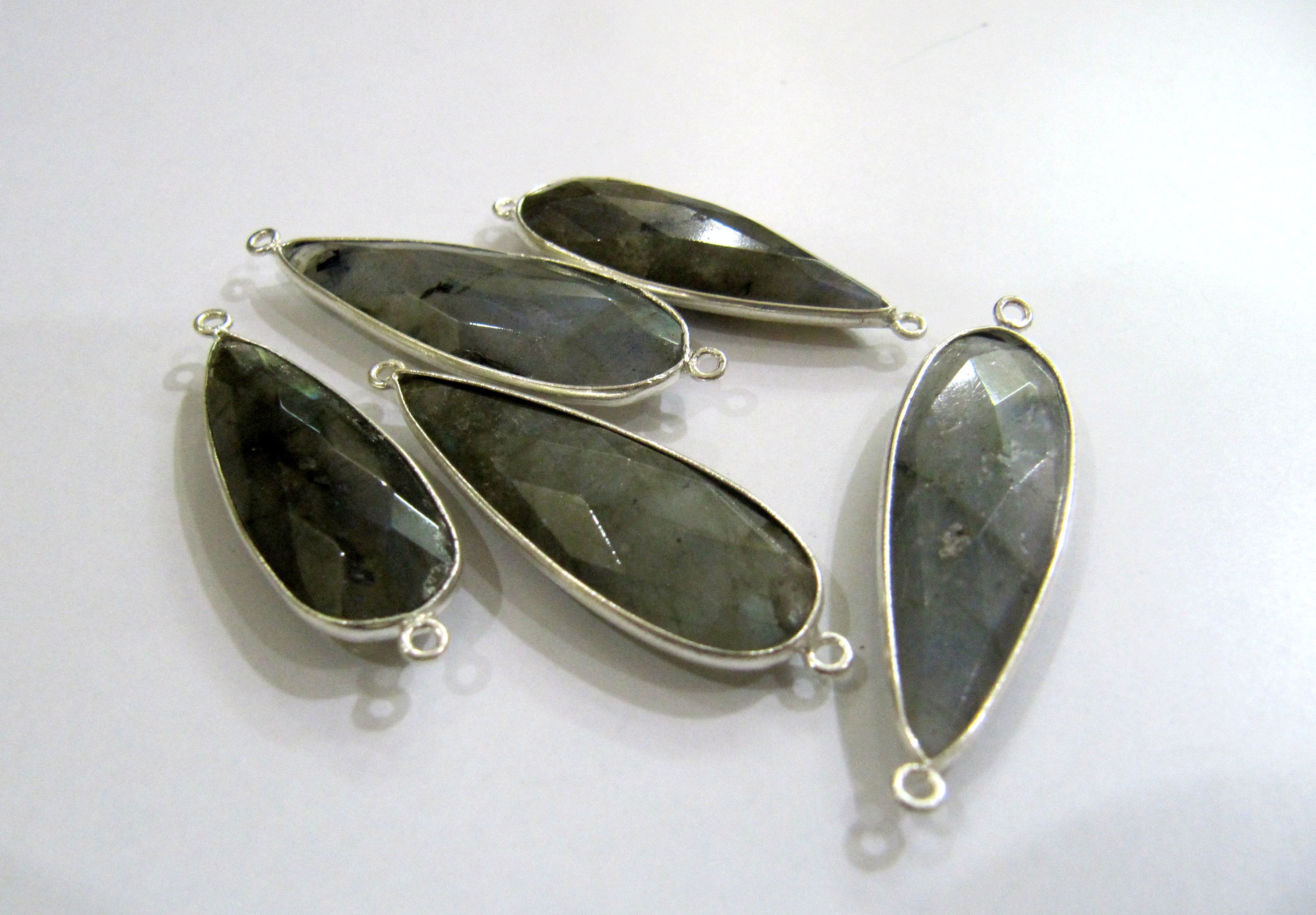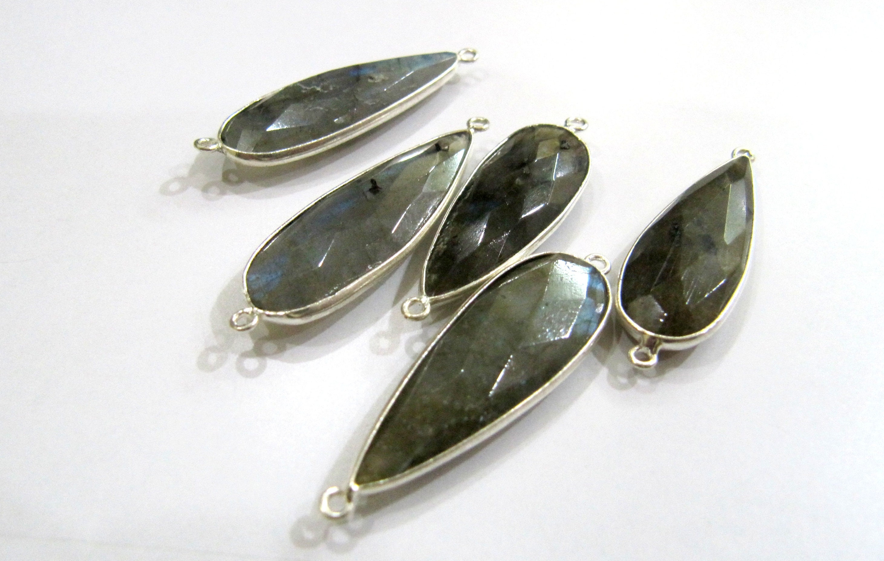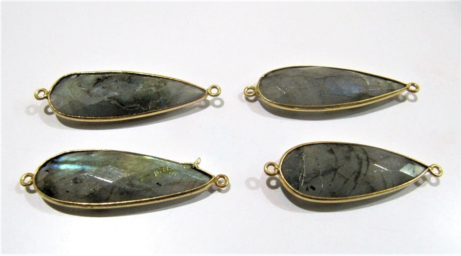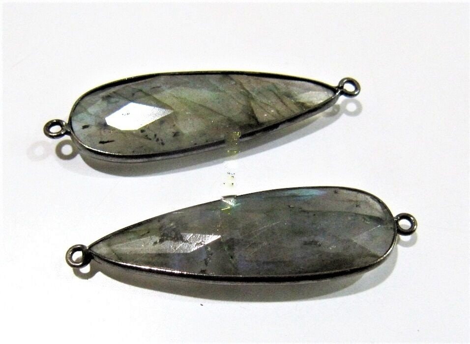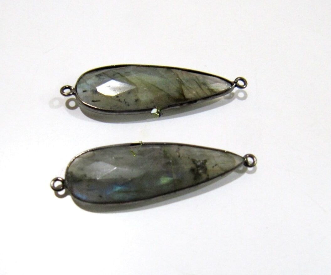 2 Pcs Set Natural Labradorite Long PearShape 10x28 to 12x30mm Briolette Connectors Gray Stone Double Loop Bezel Jewelry Making Bezel Connectors